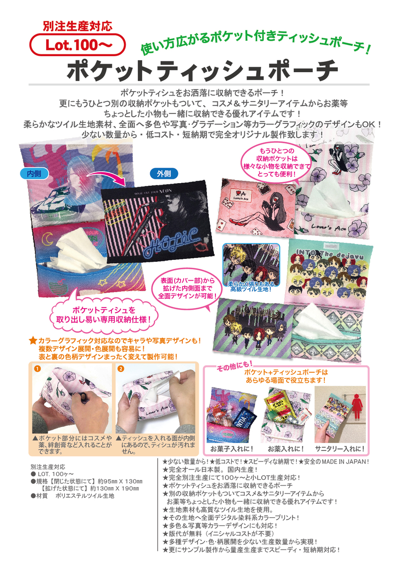 ポケットティッシュ ポーチ ブランド- ポケットティッシュケースの作り方プロセスも武井さんに撮影していただきましたので、ぜひ、作り方シート(PDF)と合わせて参考にしてくださいね。 1 裁断します。※柄が一方向の場合は画像のようにすると、フタを閉じたときに上下きれいに仕上がります。 2 画像1の★どうしを中表にポケットティッシュ用のポーチ (ケース)にお好みのデザインを印刷できます。 ポーチの素材には「ポリオフィレン」という環境にやさしい軟質素材を使用しました。 広告面が広く、繰り返し使える商品だから販促効果はバツグン! 目新しく意外性の
